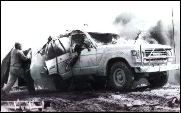 راست می گفت در عملیات کربلای پنج جاده ای بود که از میان دریاچه ماهی می گذشت و انتهای آن به سه راه مرگ می رسید. این جاده چنان زیر آتش توپ و خمپاره و تانک بود که کمتر کسی سالم از سر جاده به ته جاده می رسید. در میان وحشت و انفجار صدای مارش عملیات از بوق بلندگوی حاج بخشی به گوش رسید. در میان انبوه آتش خمپاره ها به سمت سه راه مرگ می آید اما به ناگهان ماشین مورد اصابت گلوله توپ یک تانک قرار گرفت. حاج بخشی همان دقایق اول از ماشین به بیرون پرت شد اما دامادش که جانباز بود در ماشینگیر کرد و آتش گرفت حاجی می خواست با پتو آتش را خاموش کند و او را نجات دهد اما شدنی نبود. احسان رجبی از عکاسان جنگ خودش را به صحنه رساند و این لحظه را ثبت کرد. پیترسون همین عکس را در اتاقش چسبانده بود.