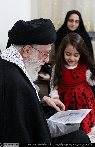 دیگر کمکم وقت خداحافظی میرسد. رهبر قرآنهایی را به یادگار به همسر و مادر شهید هدیه میدهند. آرمیتا هم از دور سرک میکشد که ببیند رهبر چه چیزی در آنها مینویسند. بعد هم که مادرش قرآن را میگیرد، آن را توی دست مادر میبوسد. رهبر از آرمیتا اجازه میگیرند که یکی از نقاشیهایش را بردارند. آرمیتا اجازه میدهد: «باشه. همین رو ببر.» و آقا نقاشی آرمیتا از خودش را برمیدارند. در این نقاشی هم، لباس دختر صورتی است. از همان صورتیها که ما بزرگترها میگوییم «بنفش». موقع خداحافظی، رهبر از آرمیتا میخواهند که «یک بوس خوشمزه» بدهد. آرمیتا هم همین کار را میکند و بعد هم خودش با بوسیدن صورت آقا، محبتش را تمام میکند.