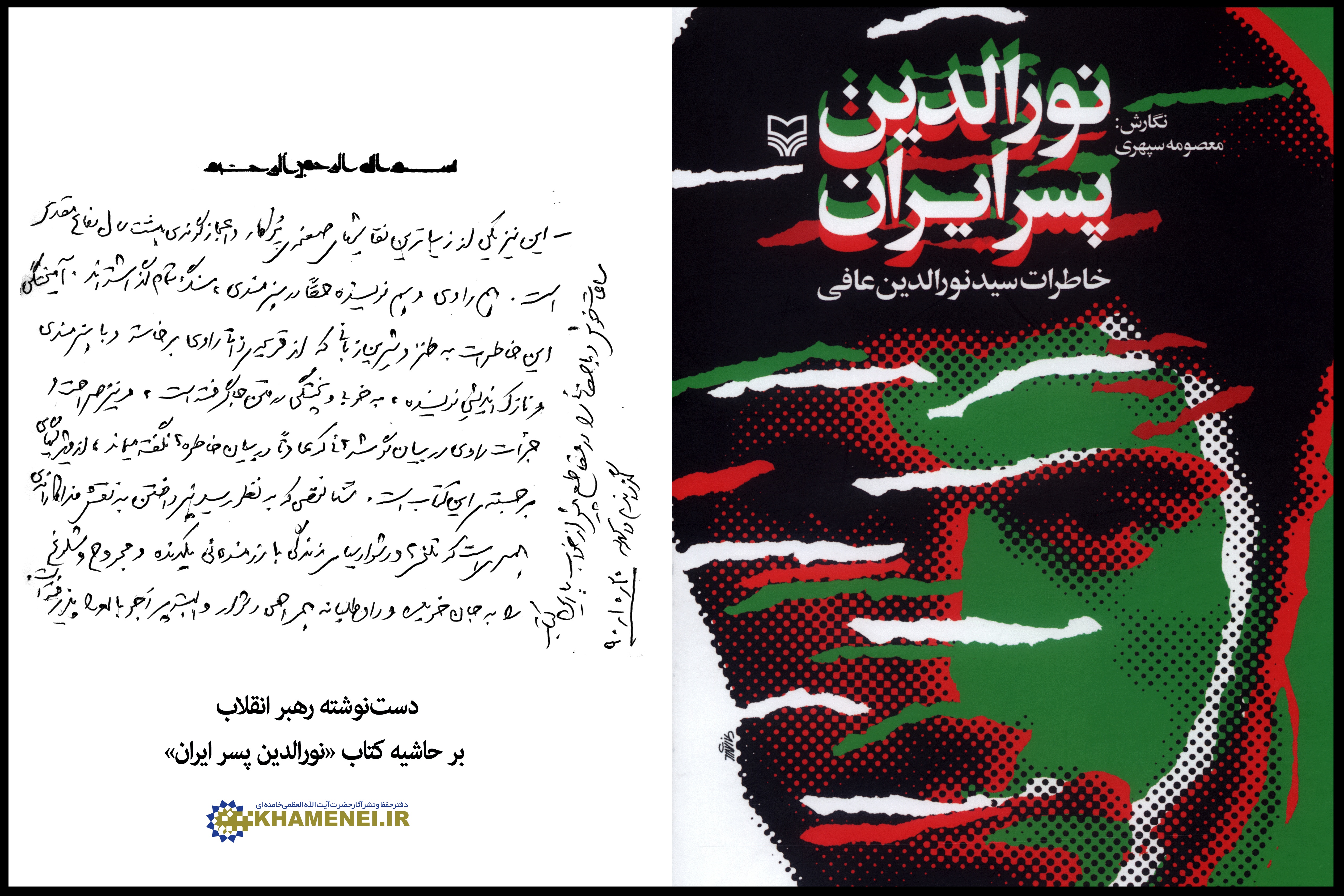 رهبر انقلاب پس از مطالعهی کتاب «نورالدین پسر ایران» تقریظی بر حاشیهی این اثر نوشتند که ظهر یکشنبه 1390/11/30 طی مراسمی به راوی، همسر راوی و نویسندهی کتاب اهدا شد. در این جلسه آقای سید نورالدین عافی راوی کتاب به همراه همسرش، حجتالاسلاموالمسلمین رحیمیان نمایندهی ولیفقیه در بنیاد شهید و امور ایثارگران و جانبازان، خانم معصومه سپهری نویسندهی کتاب، آقای محسن مؤمنی شریف مدیرمسئول انتشارات سورهی مهر، حجتالاسلاموالمسلمین محمدجواد حاجعلیاکبری نویسندهی کتاب مطلع عشق، آقای علیرضا مختارپور صاحبنظر در حوزهی نشر، حجتالاسلاموالمسلمین علی شیرازی نویسنده و فعال فرهنگی و سردار سدهی حضور داشتند.